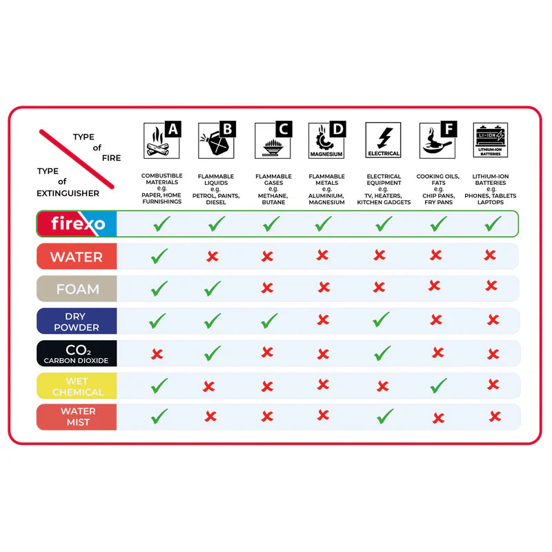 Firexo ALL FIRES 2 Litre red fire extinguisher, for ALL fire classes: A, B, C, D, Electrical, F & Lithium-ion Battery Fires. All the fire safety equipment you need in one compact extinguisher. Perfect for your vehicle, caravan, home, garage, shed or office. The safest product to have at hand in the event of a fire. Great for indoors and outdoor use in the events of an emergency with NO Confusion in ANY fire emergency situation.