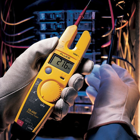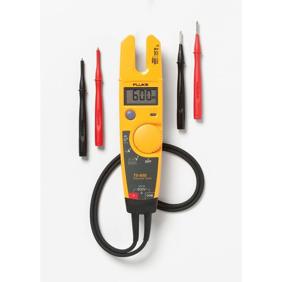 The Fluke LED Voltage & Continuity Testers T5-600 provide precise digital resolution for automatic measurements of AC and DC voltage up to 600 V. With the OpenJaw™ design, it can measure current up to 100 A without breaking the circuit, and troubleshoot resistance problems up to 1000 Ω. Designed for tight spaces, it comes with detachable Slim Reach probe tips.