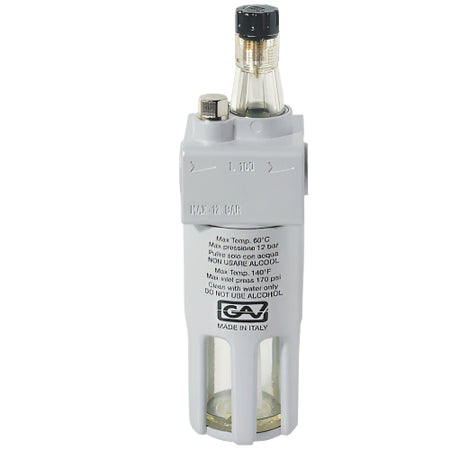 The In line Pneumatic Lubricator by GAV is a high-quality accessory made in Italy. Designed for compressed air applications, it has a maximum inlet pressure of 12 bar and a flow rate of 2200 Nl/min at 6 bar. Equipped with a protection cup and capable of holding 40 ml, this inline oiler ensures efficient lubrication for your equipment.