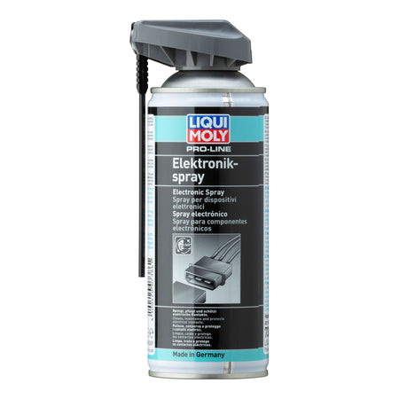 Fully synthetic, plastic-compatible electronic spray for the cleaning and maintaining dirty electrical parts. The oxide and sulphide fittings are infiltrated, this reduces contact resistances, the electronic parts are protected and the operational safety ensured. The quick-drying formula leaves no residue and is silicone free. Note: Allow propellant to ventilate for approx. 10 min. Avoid sparking.