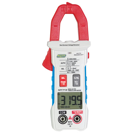 The MT713 is a 600A AC/DC Clamp Meter with indication on a large backlit LCD display, providing fast sampling time with high accuracy. The Smart mode, “AUTO”, is a function that automatically identifies DC voltage, AC voltage, Resistance and continuity and automatically displays the measurements. There is a built-in Non-Contact voltage detector, by pressing the NCV button continuously the LCD displays “EF” and will display “—-“ when voltage is detected and the buzzer sounds. The meter measures 600V AC/ DC, frequency, resistance, temperature and capacitance measurements, plus Inrush current and Peak Voltage value. Other features include a Data hold function and a built-in flashlight for dimly lit areas. Housed in a modern compact housing ideal for electricians, HVAC technicians and students studying electrical.