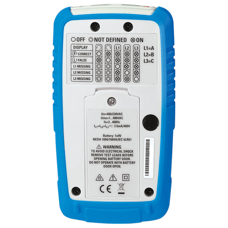The MT935 is a Dead Motor and Phase Rotation Meter compact and handheld, which is battery operated. The unit can be utilized on a 3 Phase powered system or on a 3 Phase unpowered motor without having to worry about damage to the tester. When used on a 3 Phase powered system the meter is a field indication instrument which displays all three phases by lighting up its corresponding lamp. It then displays the rotation for clockwise or anti clockwise on an LED. In 3 Phase motors it is possible to determine the motor connections U, V and W without mains voltage present, thus avoiding damage to pumps with reversed motor rotation. It operates from 1VAC to 400VAC.