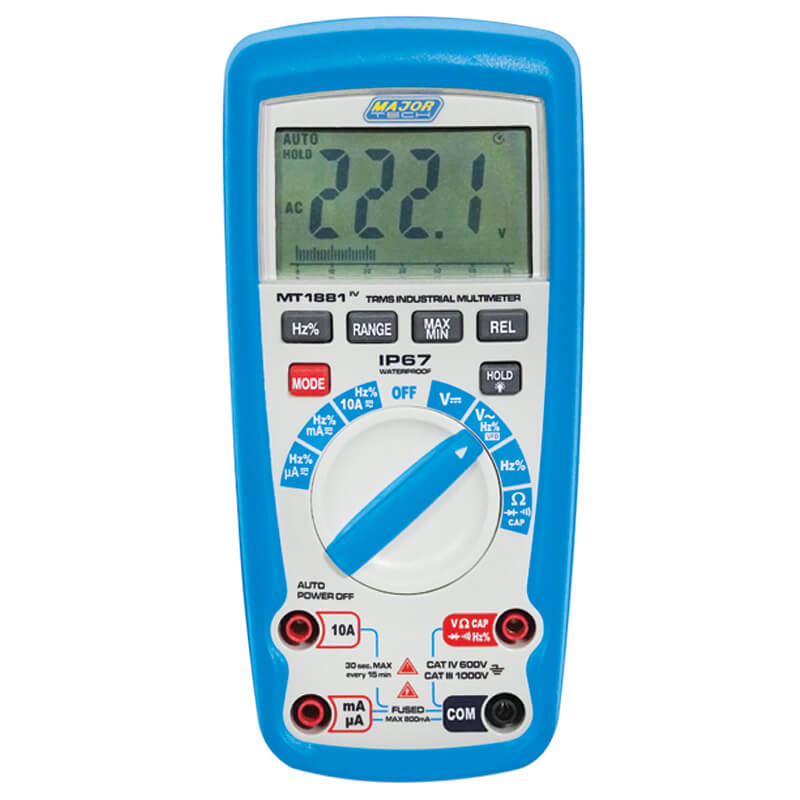 The MT1881IS is an Intrinsically Safe 1000V AC/DC IP67 True RMS Multimeter that has a large 6000 count backlit LCD with a 61 segment analogue bar graph, especially designed for everyday use by electricians. Capable of measuring 1000V AC and DC, with added measuring ranges of Resistance, AC/DC Current, Capacitance and Frequency. The meter has been designed that should a user turn the rotary switch in any direction whilst an input of less than 1000V AC/DC is applied to the meter, the meter will not get damaged. NCV function, automatic Non-Contact voltage detection, the LCD backlight will glow red when AC voltage above 110V is sensed. The meter has a double moulded rubber case with IP67 waterproof and dustproof rating, rugged design for heavy duty use.