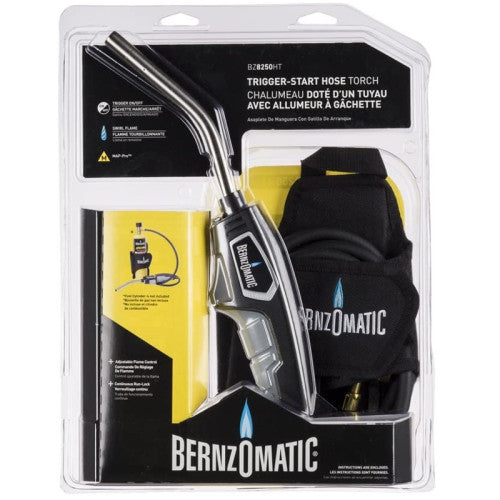 The Bernzomatic BZ8250HT Trigger-Start Hose Torch comes with a 1,5 m (5 foot) hose, the torch provides the user with maximum reach to make any job easier. The versatile torch features an instant on/off trigger igniter for simple one-handed operation and a high intensity swirl flame that provides a hotter and a more efficient flame. The Bernzomatic BZ8250HT Trigger-Start Hose Torch can be used to complete a variety of household projects, including small diameter soldering, thawing, melting and various other heat applications.