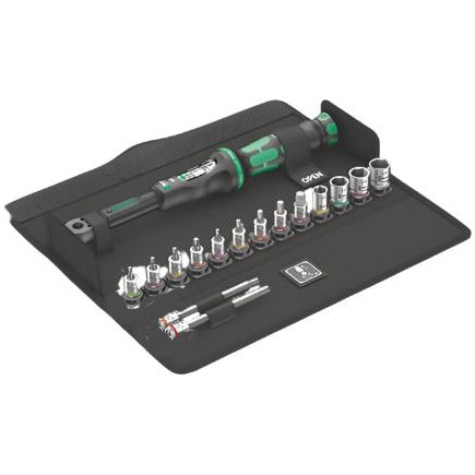 The 16-piece set from the screwdriving tool specialist Wera solves the most important screwdriving problems associated with bicycles, with reliable control of applied torque to protect sensitive components. With a click-torque wrench in the unmistakable Wera design. Very robust design with high accuracy as per DIN EN ISO 6789-1: 2017-07. Easy setting and saving of the default values. The audible and tactile snapping on reaching the scale values also facilitates the safe setting of the desired torque values. The robust release mechanism guarantees a clearly audible and tactile trigger signal when the set torque is reached. For clockwise torque-control and with a reversible 45-tooth ratchet. The torque wrench is extremely space-saving and supplemented with accessories that are suitable for the torque range and adapted to the most common screwed connections on bicycles; in a robust, surface-friendly textile box. Included are: Click Torque A 5, 1/4", 2.5 - 25 Nm, 4 sockets with 1/4" drive, 7 Hex Plus hexagon bit sockets and 4 TORX® bit sockets. Sockets and bit sockets with "Take it easy" tool finder with colour coding by size - for easy and quick location of the required tool. Bit sockets with holding function for extra comfortable screwdriving without the screw falling off the tool. Incredibly compact arrangement for a lot of tools in a small space. Textile box with very high robustness and longevity. Additional surface protection through the textile outer material. Low weight and volume for easier mobility. Bit sockets with all the benefits of Wera bit technology such as fitting accuracy, wear resistance and concentric run-out properties.